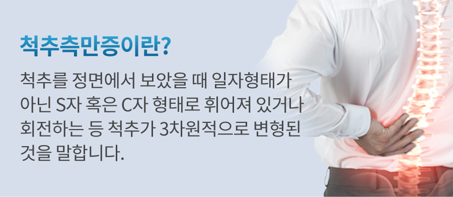 인체의 각 관절, 근육 등의 연부조직이 외부의 충격, 강력한 비틀림, 당김, 압박 및 장기간의 피로 등으로 인해 구조적인 손상을 벋어 통증이 발생합니다. 정상적인 척추는 정면에서 보았을 때 반듯하게 골반위에 있어야 합니다. 그러나 척추가 ‘L자’나 ‘C자’ 모양으로 휘어지고 동시에 척추 마디마디가 회전하여 틀어지는 변형을 함께 동반하기도 하는데, 이러한 척추의 변형을 척추측만증이라고 합니다.