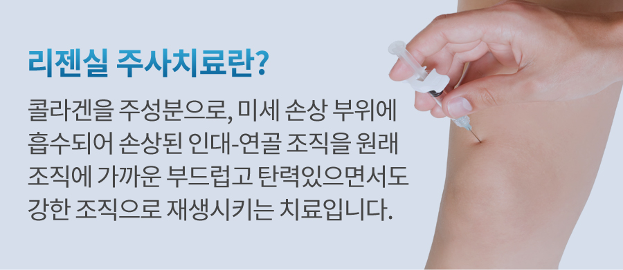 인대파열/연골파열 등 뼈를 제외한 근골격계 손상이 발생한 경우에, 손상이 심하면 수술적 치료를 하게 되지만 수술을 할 만큼 다치지는 않은 미세 손상을 입은 경우가 있습니다. 기존에는 손상 부위를 고정하고 물리치료, 약물치료 등으로 보존적 치료를 했지만, 치료 후에도 통증이나 운동 제한이 지속되는 등 완전한 치료가 되지 않는 경우가 많았습니다. 회복이 된 후에도 원래 조직과는 다른 딱딱하고 충격에 약한 조직으로 바뀌는 경우가 많은데, 이런 경우에 다시 파열이 발생할 확률이 매우 높습니다. 리젠실Ⓡ 주사는 활성화 콜라겐을 주성분으로 하며 미세 손상 부위에 흡수되어 손상된 인대-연골 조직을 원래 조직에 가까운 부드럽고 탄력있으면서도 강한 조직으로 재생시키는 치료입니다.