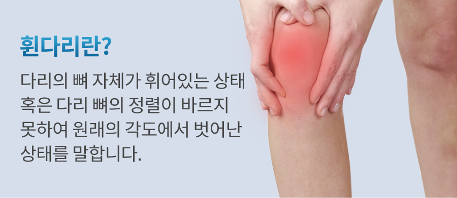 휜다리는 증상이 심해지면 미용상의 문제를 넘어 과도한 무릎 관절의 스트레스로 인해 퇴행성 관절염이나 척추에도 영향을 주고 측만증이 나타날 가능성이 높아집니다. 휜다리는 다리를 묶거나 좌우에서 힘을 가하는 방식으로 치료해서는 안 됩니다. 교정을 통해 골반과 고관절의 틀어진 각도를 바로 잡아주는 것만이 근본적인 치료 방법입니다.