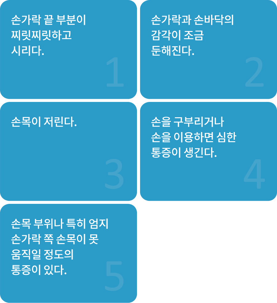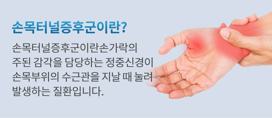손으로 가는 중요한 신경 2개중의 하나로 손바닥의 감각과 손목, 손의 운동기능을 담당하는 정중신경이 있습니다. 이 신경은 손목부분에 인대로 이루어진 터널(속목터널 또는 수근관)을 통과하게 되는데 손목의 반복되는 무리한 사용이나 퇴행성 변화에 의해 인대가 두꺼워지고 이로인해 터널 내부가 좁아져 터널 안을 통과하는 신경이 압박을 받게 됨으로 인해 손이 저리고 나중에는 감각이 마비되고, 손의 사용마저 부자연스러워지게 되는 질환입니다.