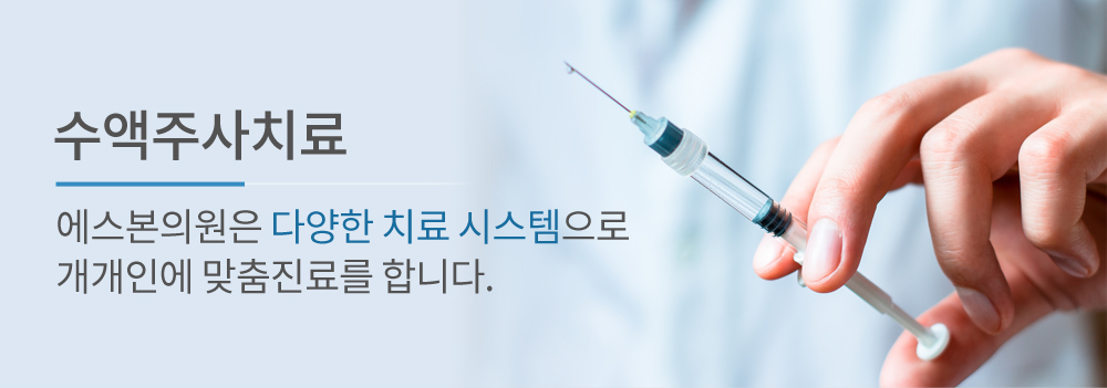 에스본의원의 수액주사치료는 관절의 통증, 염증을 효과적으로 줄여주는 역할을 합니다. 신경염을 감소시키는 비타민과 미네랄의 작용으로 도수치료, 물리치료와 병행할 때 효과가 극대화됩니다. 외상이나 수술 등 조직 손상이 있을 때에도 적절한 수액주사치료로 빠른 회복을 기대할 수 있습니다.