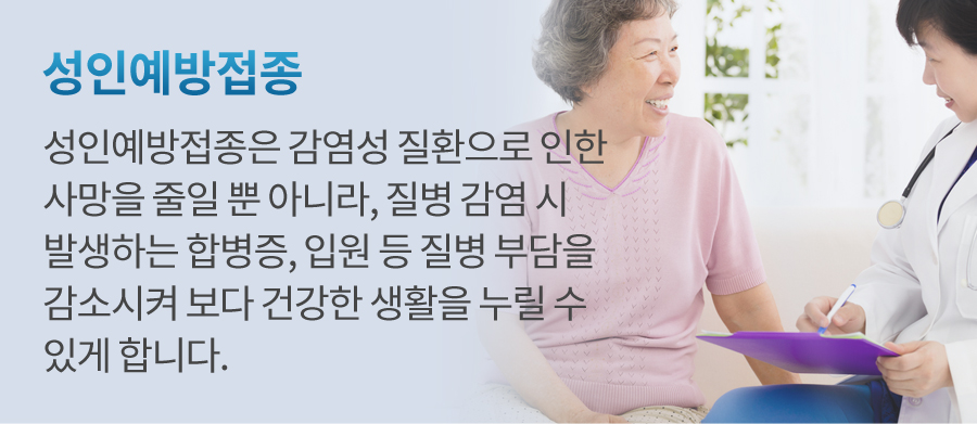 예방접종은 감염병 예방에 가장 효과적이고 안전한 공중보건 중재 수단입니다. 지금까지는 영유아를 중심으로 예방접종을 하였으나 상대적으로 성인 예방접종에 대해서는 적극적이지 못하였는데, 최근 건강에 대한 관심이 고조되면서 성인 예방접종 분야에 대한 관심 역시 증가하고 있으며, 성인 예방 접종의 필요성이 점차 제기되고 있습니다.